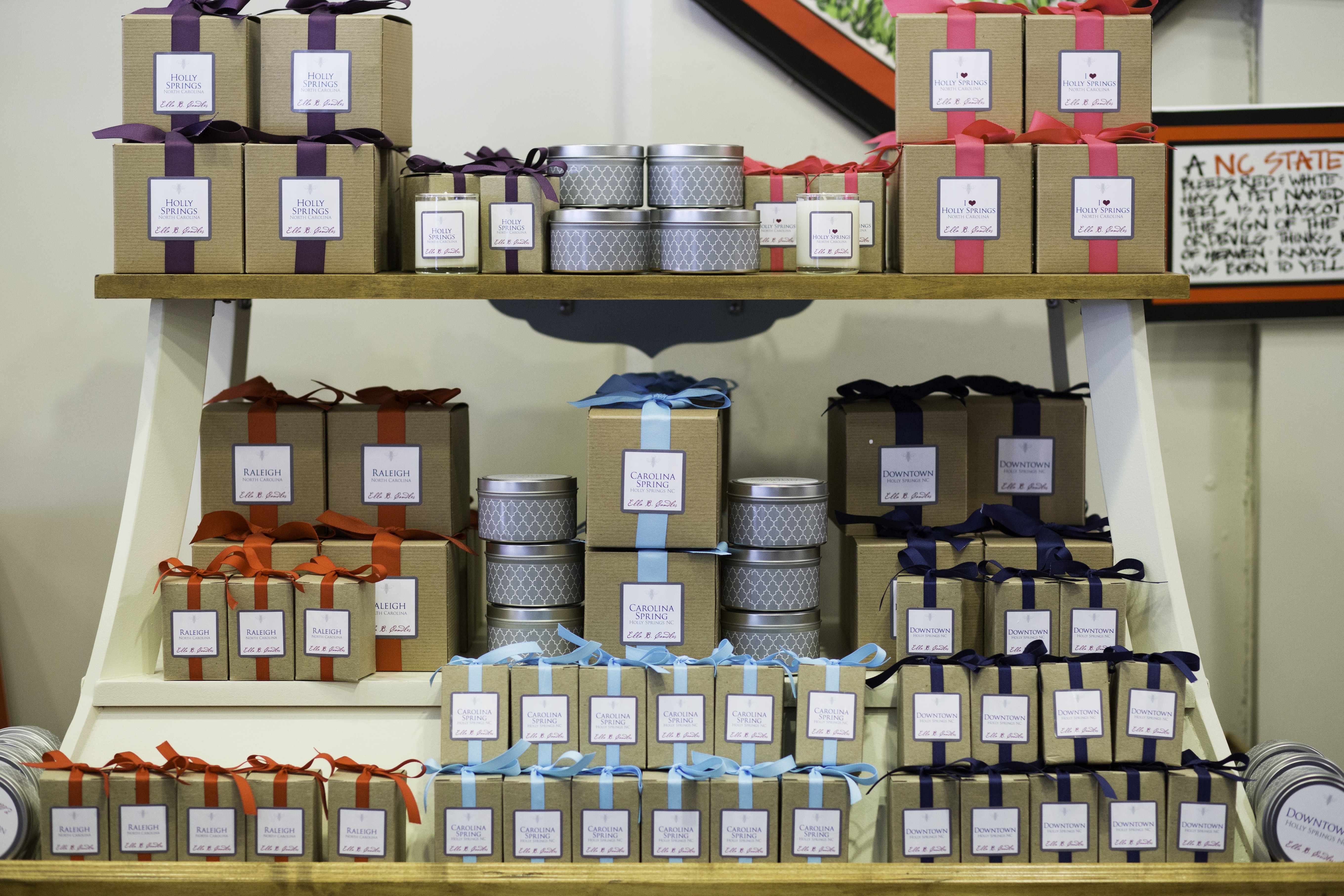 We also love showing our out of town family and friends all of our favorite locally made gems! One of our favorite items that we recently started carrying are Ella B candles! These soy candles smell AMAZING and are made in NC! They can be the perfect going away present or graduation present – perfect way to take a little bit of home away with you!